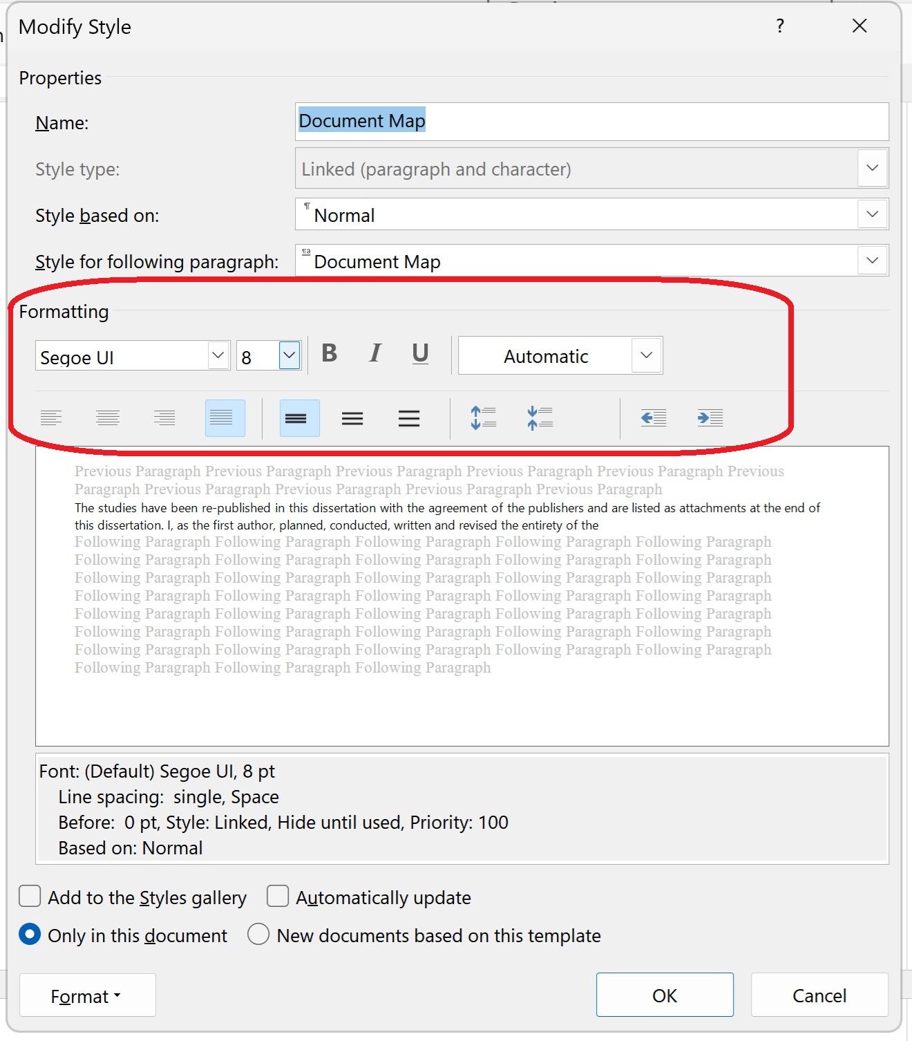Once you’ve changed the font, and decided whether you want to add this style to the gallery (hopefully not, as you’ll never need to change it again!) and whether you only want this change for this document or all new documents based on the same template (not so useful if you only work on documents originating with other people), press “OK”.