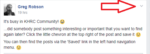 To save a post on Facebook, click on the down arrow in the top right hand corner of the post: