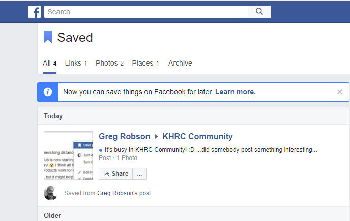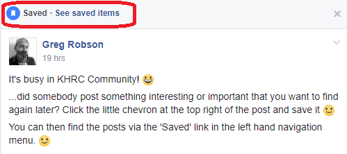 Did you know that you can save a post on Facebook so that you could return to it afterwards without having to search for it? Here’s how to save a post in Facebook (with thanks to Greg Robson for pointing this out and Dave Johnson for a note on the mobile app).