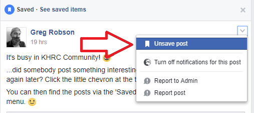 Once you have saved a post, clicking on the down arrow again will give the new option, Unsave post: