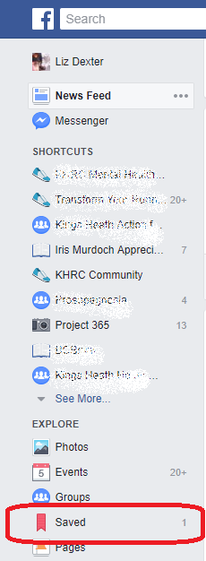 To view your saved items, go to your Home screen (not your own timeline, but Home) and look at the menu on the left-hand side. Below your shortcuts, under Explore, is a new Saved section, with the number of saved posts next to it (this only appears when you have saved at least one post):