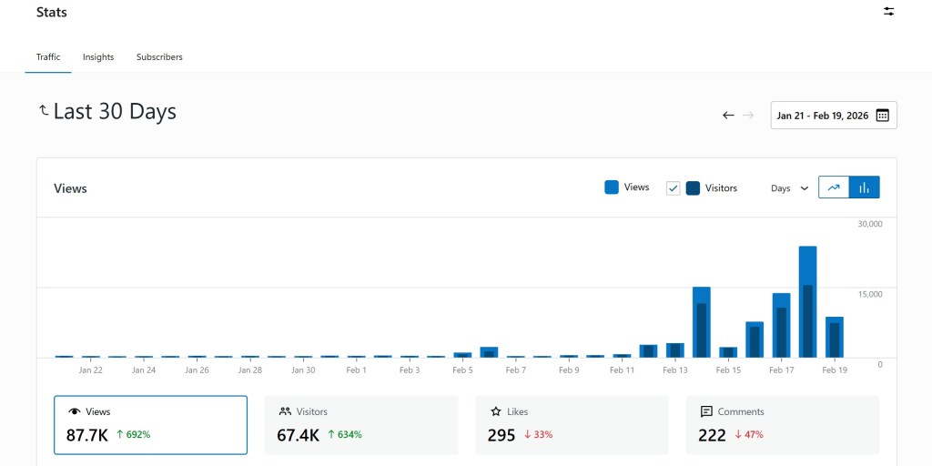 I usually get about 450 hits per day maximum. From 12 Feb I’ve had over 2,700 per day, 15,000 on 14 Feb.